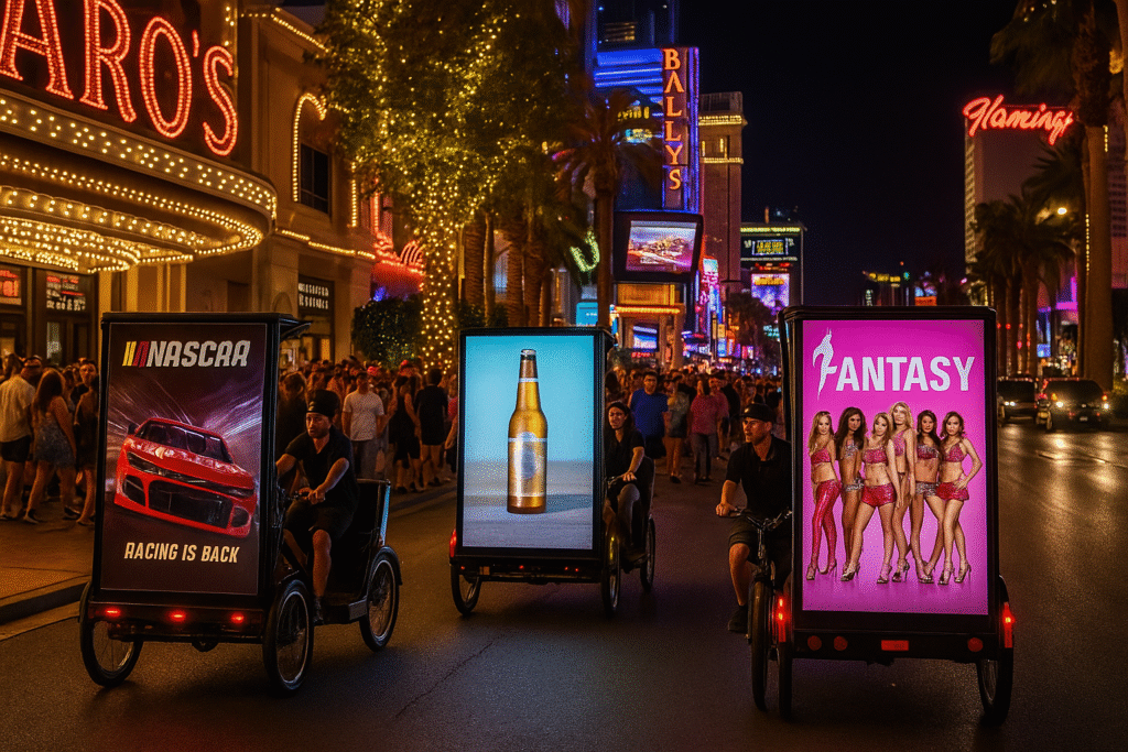 Picture a vehicle, ad bikes, adbikes, or AdBikes outfitted with vivid LED displays or resilient vinyl wraps, led trucks, or AdTrailers, designed to manoeuvre through city centres, event locations, or event venues as needed.